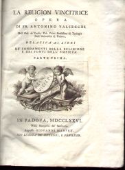 OPERA DI FR. ANTONINO VALSECCHI RELATIVA AI LIBRI DE' FONDAMENTI DELLA RELIGIONE E DEI FONTI DELL'EMPIETA'. Due volumi in 8°,legatuta cartonata marmorizzata con titoli in oro su tassello al dorso, VOLUME.1°: pagine 224, VOLUME 2°, pagine 300, bella incisione in antiporta, ampi margini, piccole abrasioni ai bordi, copia buona.