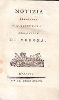 Volume in 16°, pagine 168, una pianta di Verona e due incisioni (Arena e Arche Scaligere) ripiegate fuori testo, vignetta in xilografia nel frontespizio. Brossura coeva muta. Ininfluenti tracce di tarlo da pagina 81 a pagina 168, strappi e mancanze nel dorso nel dorso, legatura un po' lenta. Il nome dell'autore si ricava dai repertori. Copia buona.