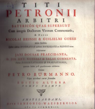 TITI PETRONII ARBITRI SATYRICON QVAE SUPERSUNT CUM INTEGRIS DOCTORUM VIRORUM COMMENTARIIS; & NOTIS NICOLAII HEINSII & GUILIELMI GOESII ANTEA INEDITIS; QUIBUS ADDITAE DVPEYRATT &AUCTIORES BOVRDELOTII AC .......CURANTE PETRO BURMANNO. AMSTELAEDAMI, APUD IANSONIO - WAESBERGIOS 1743. Vol.in 8°, leg. m. pelle, con titoli in oro al dorso, bella incisione in rame nell'antiporta, pp. 888, alcune incisioni nel testo; colophon: lugduni batavorum, typis dammeanis, mense majo MDCCXLII. Dorso legg. staccato. Firma di possesso nel frontespizio. Buona copia.