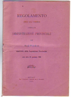 REGOLAMENTO APPROVATO DALLA DEPUTAZIONE PROVINCIALE CON ATTO 10 GENNAIO 1905. Volume in 8°, brossura editoriale, pagine 24, buona copia